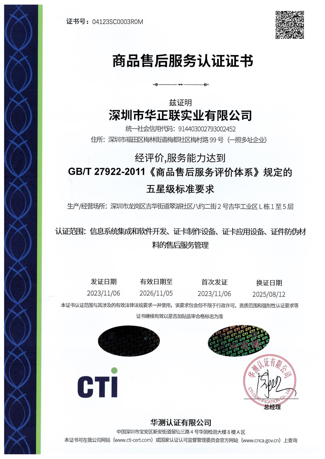 商品售后服务证书